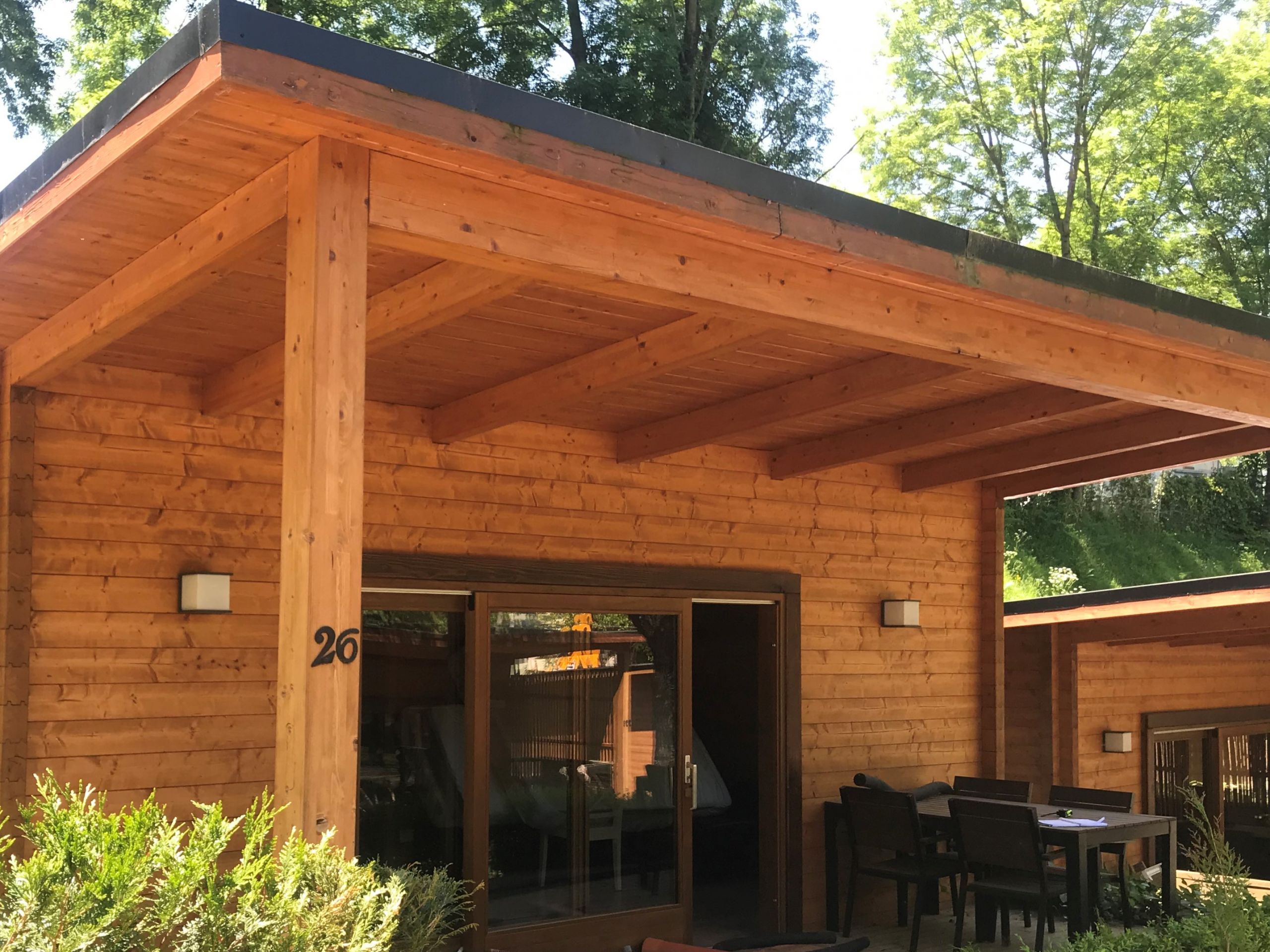 En la casa de madera que le hicimos a este cliente en concreto, el cliente deseaba que la mayoría de los elementos fueran de madera y que a su vez se aprovechará al máximo la luz natural, por esta razón se colocaron puertas deslizantes de vidrio pudiendo captar toda la luz natural posible, a su vez, se colocaron mobiliarios exteriores para aprovechar todos los espacios de la casa.